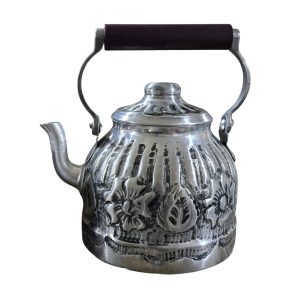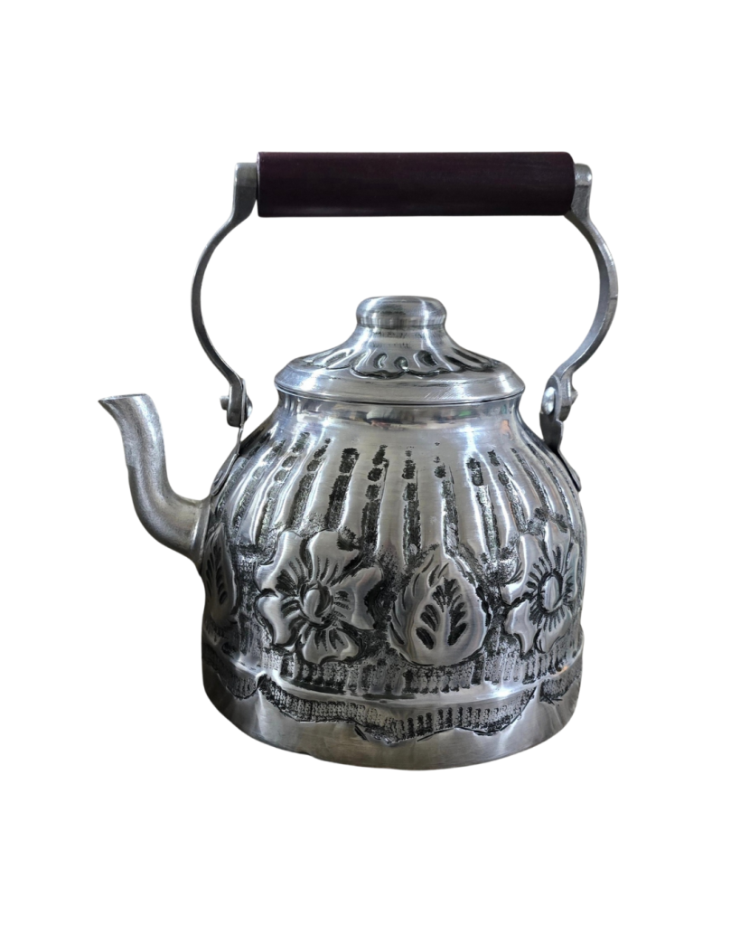 Sutil y encantadora. Elaborada en aluminio cincelado con un delicado diseño de flor, esta tetera une lo artesanal con la calidez de lo cotidiano.