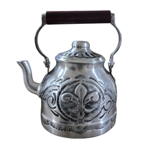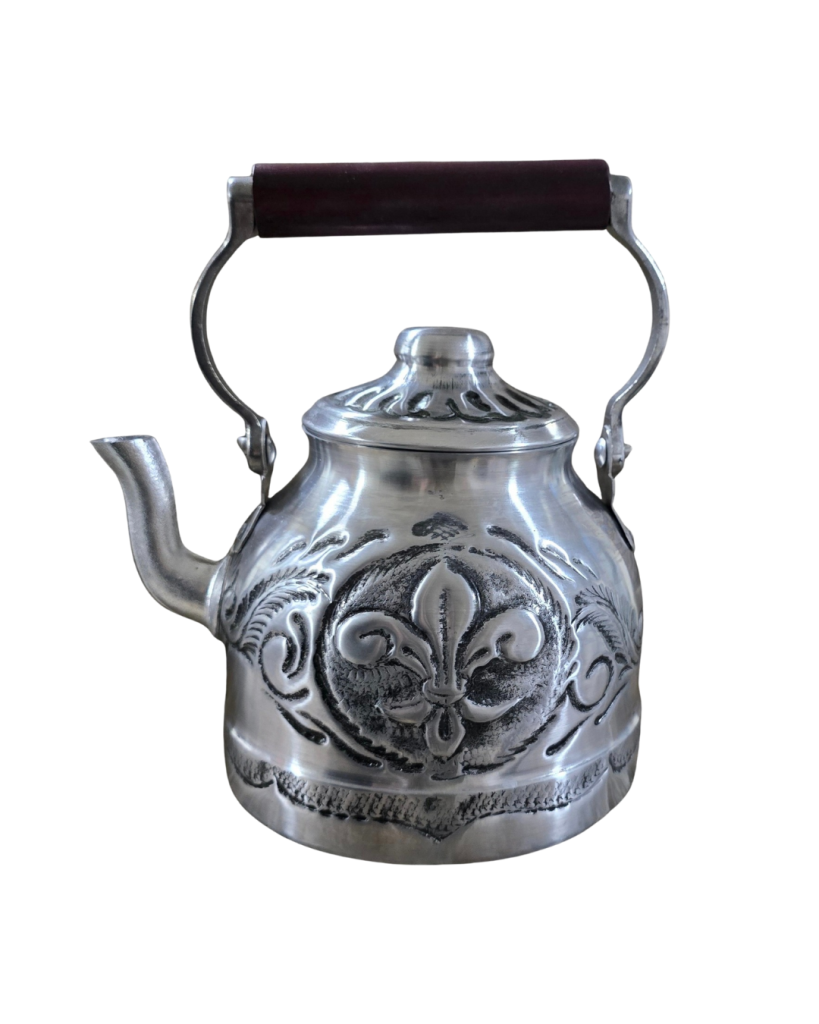 Distinción en cada detalle. Fabricada en aluminio cincelado con un refinado diseño de Flor de Liz, esta tetera combina tradición y elegancia. Ideal para quienes disfrutan el mate con un toque de nobleza.